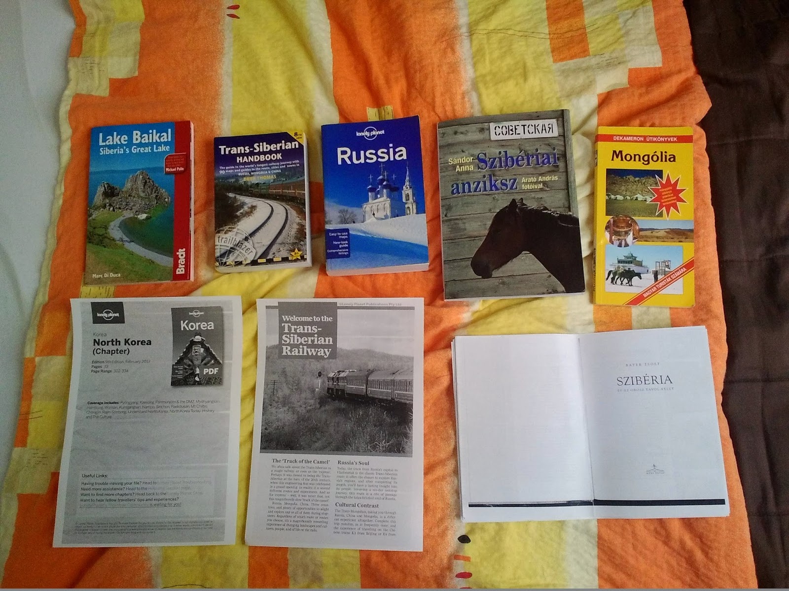 A legfontosabb kiindulópont a szokásos Lonely Planet Russia kötete. vagy egyeseknek a Frommer’s :D ) Ebben minden lényeges információ benne van. Ennek ellenére ehhez az úthoz még beszereztem pár könyvet. Sajnos magyarul ezek többsége nem kapható. A transszibériaihoz hasznos tippeket adott még: Bryn Thomas – Tran-Siberian Handbook, valamint az LP Transsiberiankiadványa. Utóbbit csak pdf-ben rendeltem meg. Mivel a Bajkál-tónál több időt eltöltök, ide elengedhetetlen volt Marc di Luca: LakeBaikal: Siberia’s Great Lake könyve a Bradt gondozásában. Sokkal részletesebb, mint az LP ezen fejezete. Szibériához nyújtott hasznos infót Bayer Zsolt: Szibéria és az orosz távol-kelet, valamint Sándor Anna: Szibériai anziksz. Ezek főleg érdekességeket írtak. Mongóliáról bármi hihetetlen, de van magyar nyelvű útikönyv. Igaz 2005-ös, de Dr. Obrusánszky Borbála írt erről egy könyvet. A hibája, hogy kevés az olyan infó, mely egy utazáshoz szükséges, és több az olyan benne, ami felesleges. De legalább van. Itt viszont szerencsém volt, mert az LP-nek pont májusban jelent meg a legújabb Mongólia kiadványa, amit PDF-ben megrendeltem.